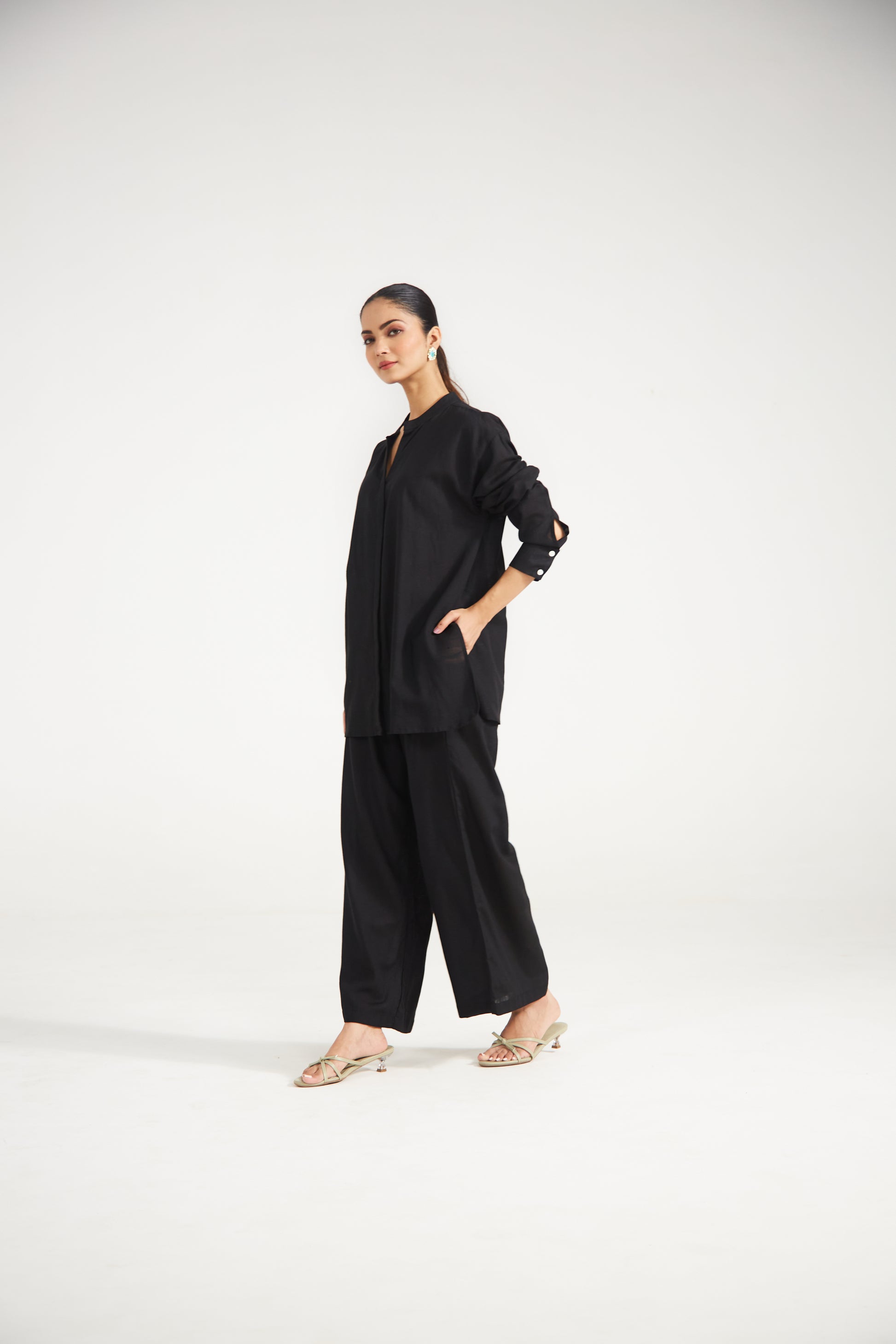 "Black co-ord set features a straight-cut front open shirt with side slits. Paired with easy straight-fit trousers, it’s a versatile ensemble that moves seamlessly from casual days to understated gatherings.