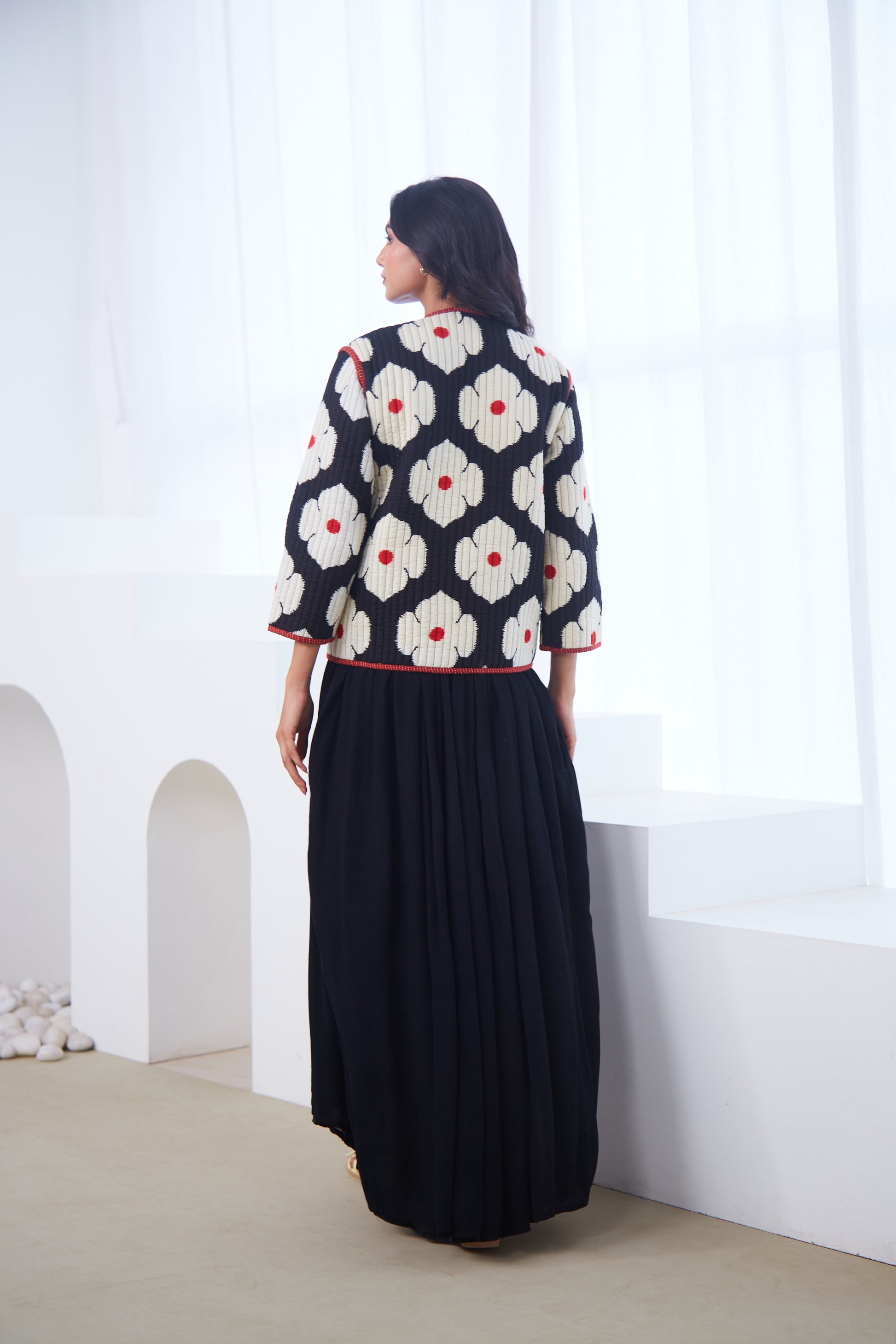 Make a bold yet elegant statement with this Black Quilted Cotton Jacket. Adorned with oversized ivory floral motifs, it brings together structure and softness in perfect balance. The quilted texture, contrast piping, and front pockets add both comfort and charm — ideal for layering over dresses or kurtas through the cooler months.