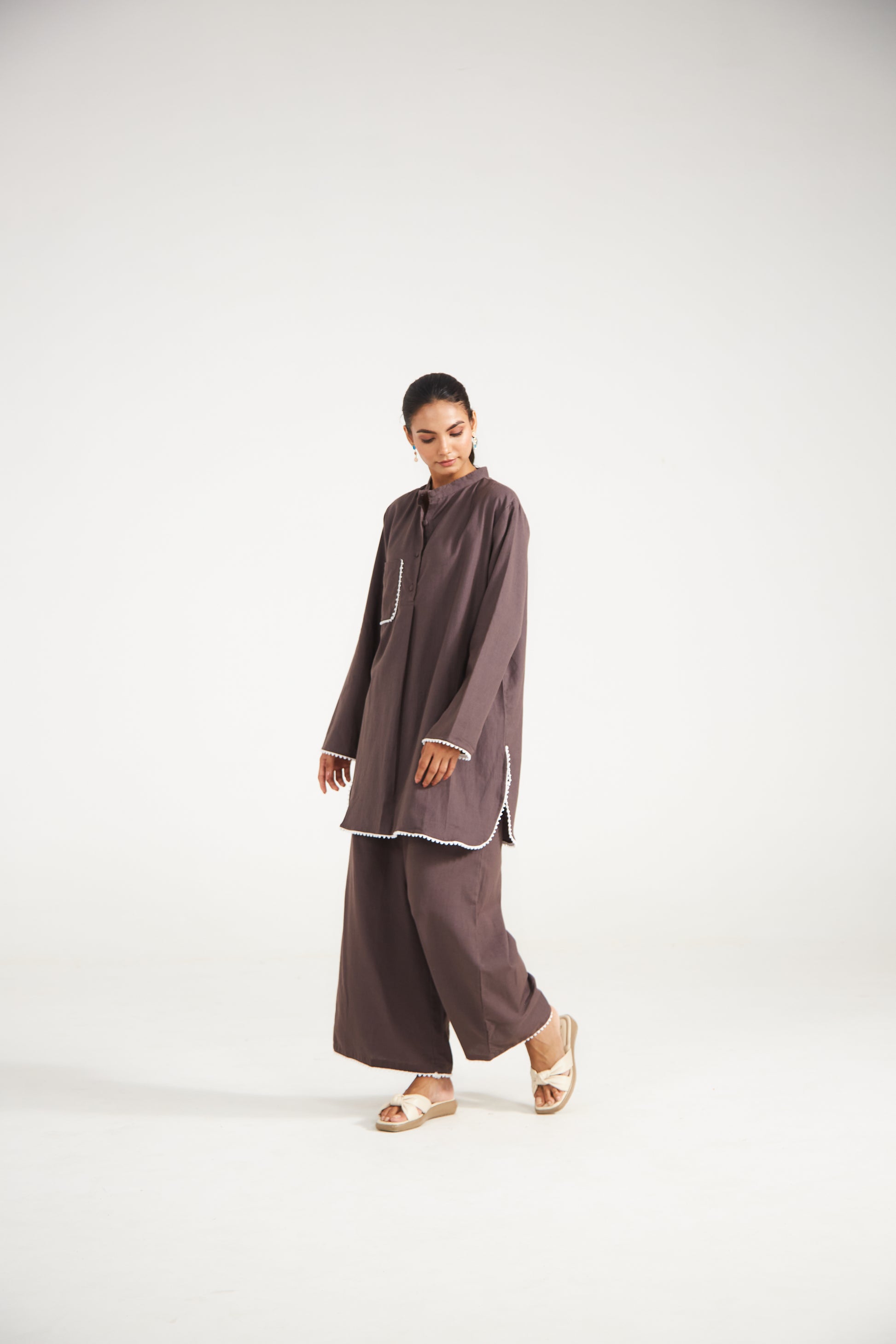"Crafted in a rich mocha brown hue, this straight-cut tunic is paired with relaxed, wide-leg pants, creating a balanced silhouette that feels comfortable. Delicate detail on pocket, tunic hem, sleeves and pants hem, adding subtle texture and character to the ensemble. Perfect for workdays and casual outings, this set blends simplicity with handcrafted charm for a graceful, all-day look.