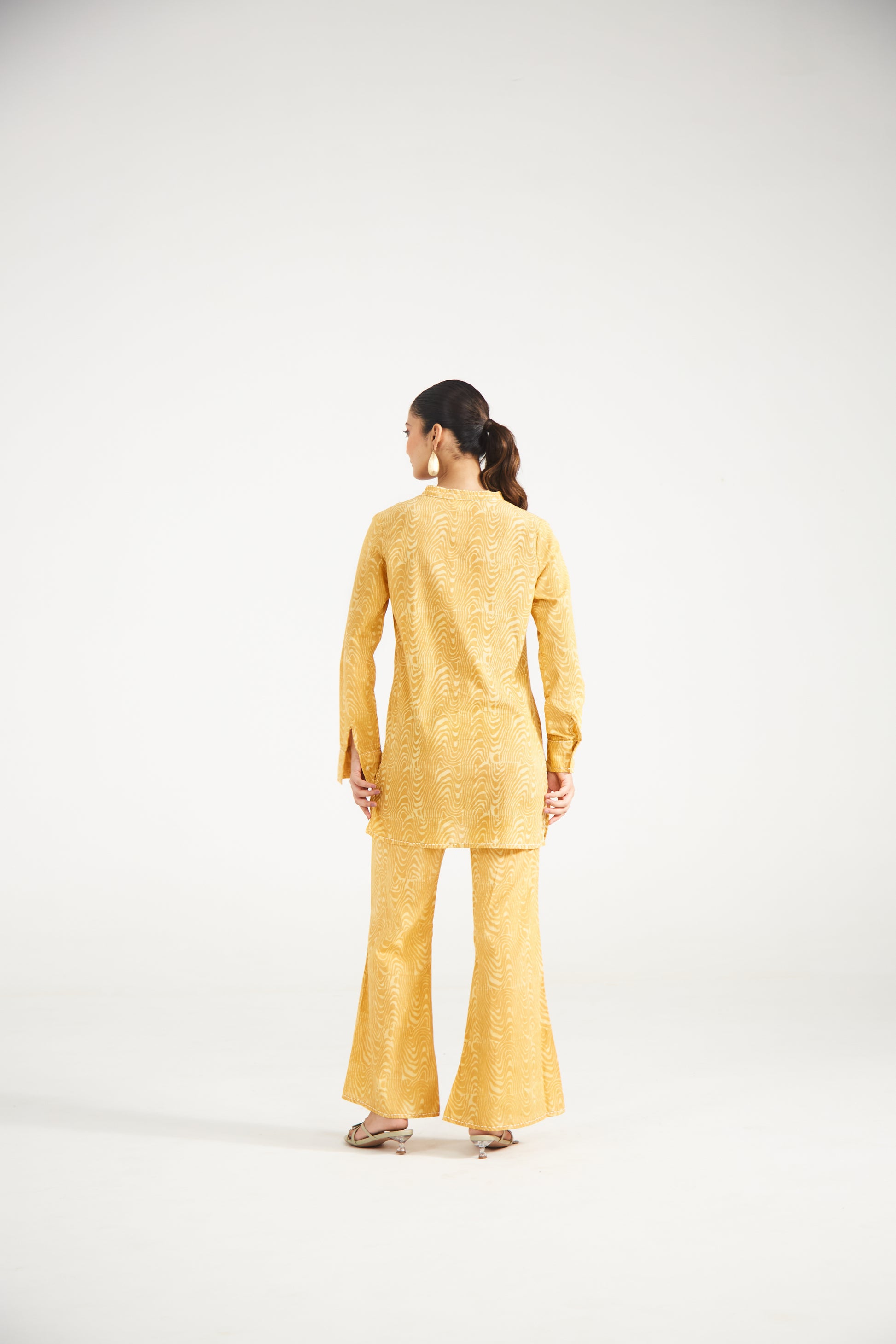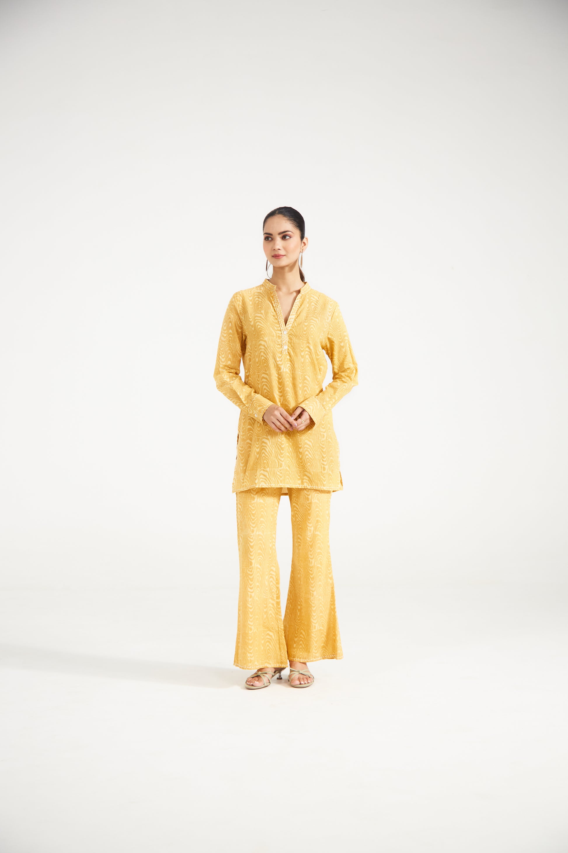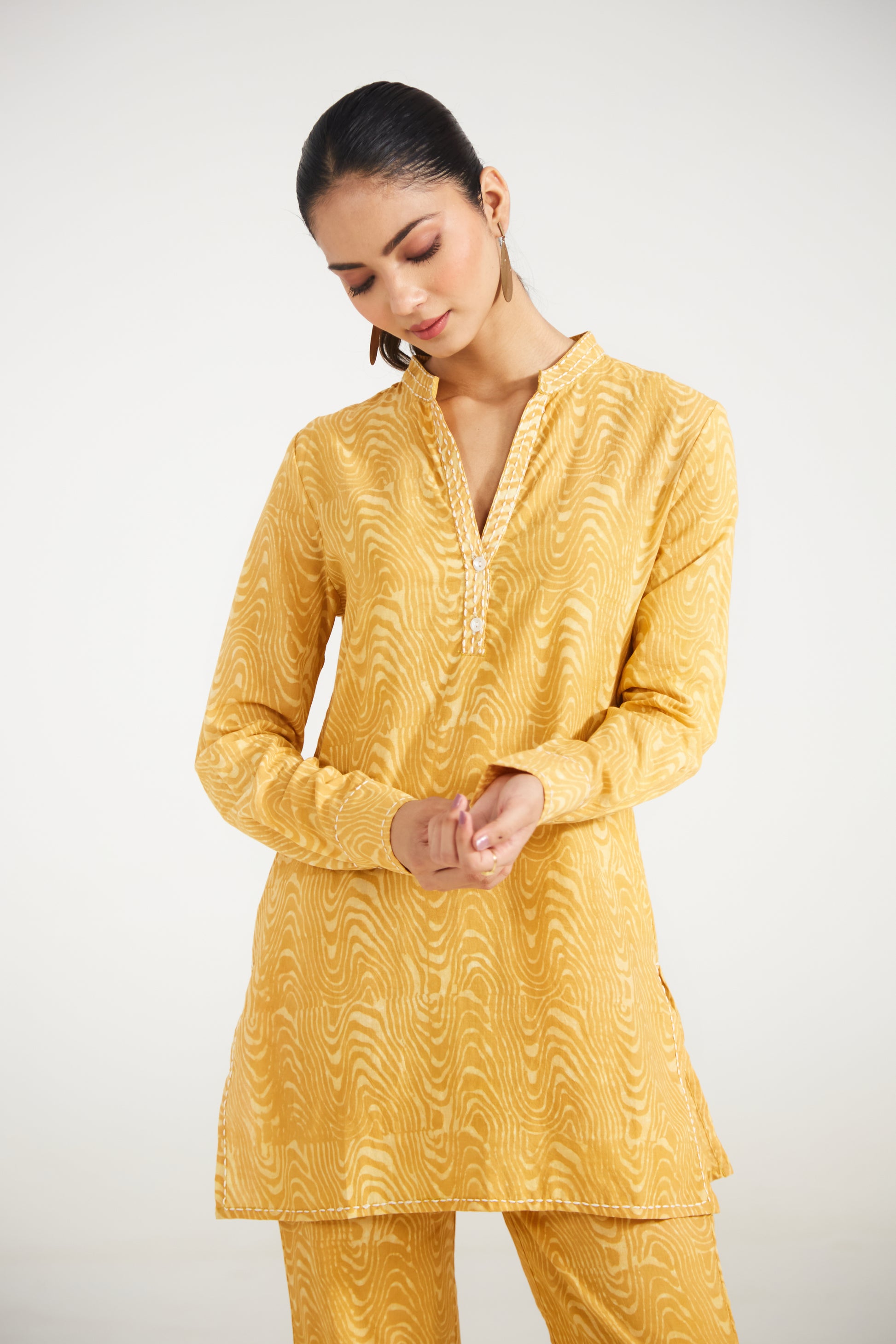 "Mustard yellow co-ord set features an all-over subtle wave-inspired print, a clean slit neckline, and full sleeves with cuffs for a structured yet relaxed look. It has handcrafted kantha embroidery along the neckline, sleeve cuffs, and neatly finished hem, highlighting fine artisanal detailing. Paired with coordinated straight pants, this set blends comfort with understated sophistication—perfect for everyday wear, festive mornings, or relaxed gatherings.