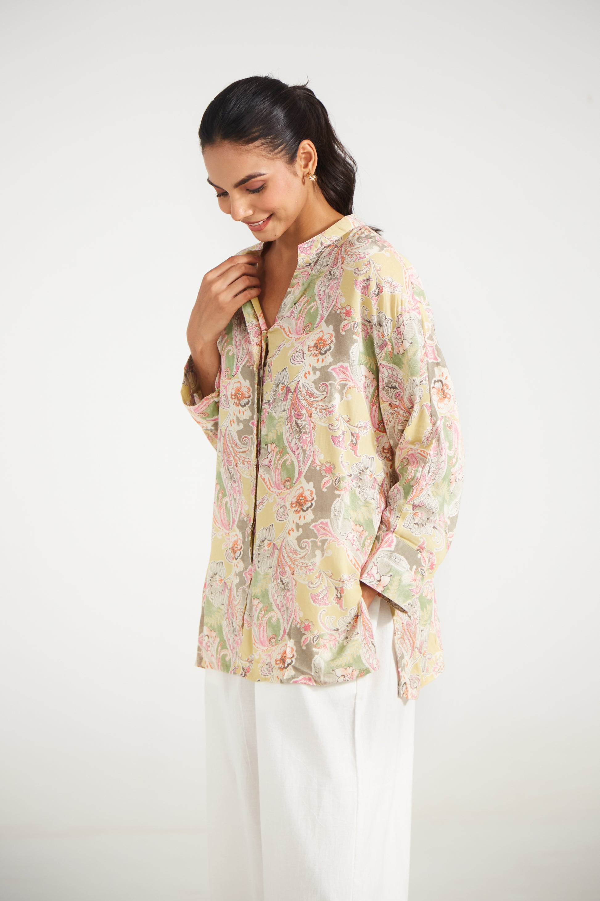 Pastel Paisley Flow Shirt is crafted from a soft, lightweight modal fabric with a graceful drape. Adorned with delicate paisley motifs in muted pinks, greens, and beige. The relaxed silhouette and soft band collar make it perfect for both brunches and evenings.