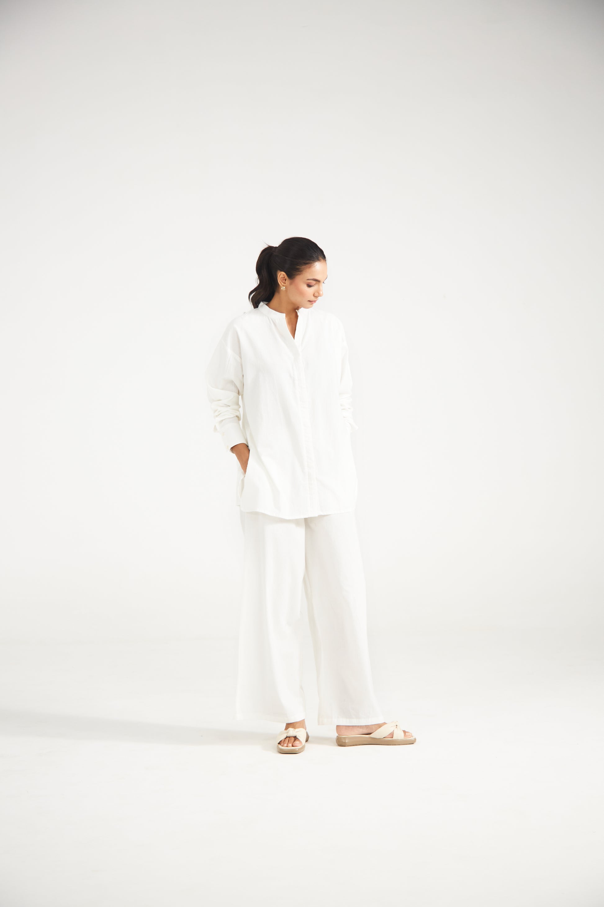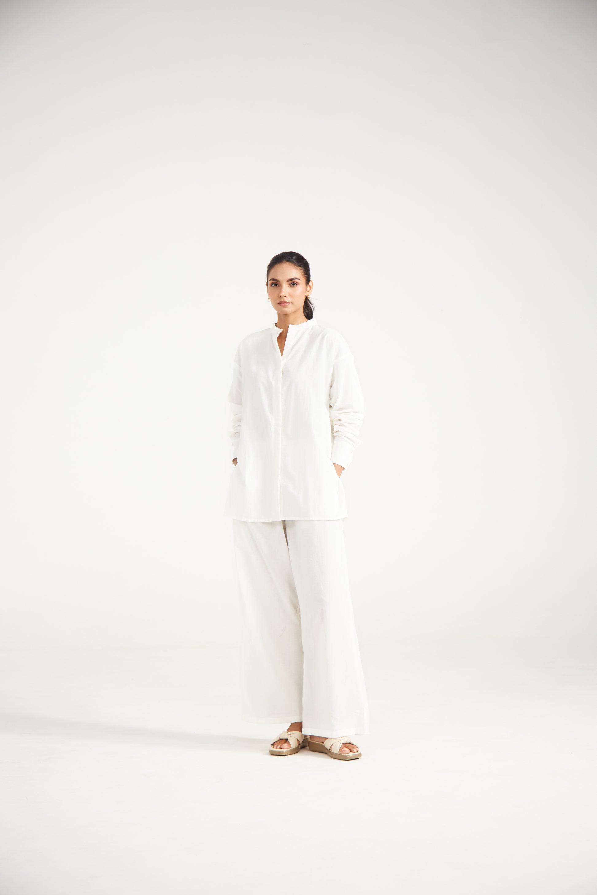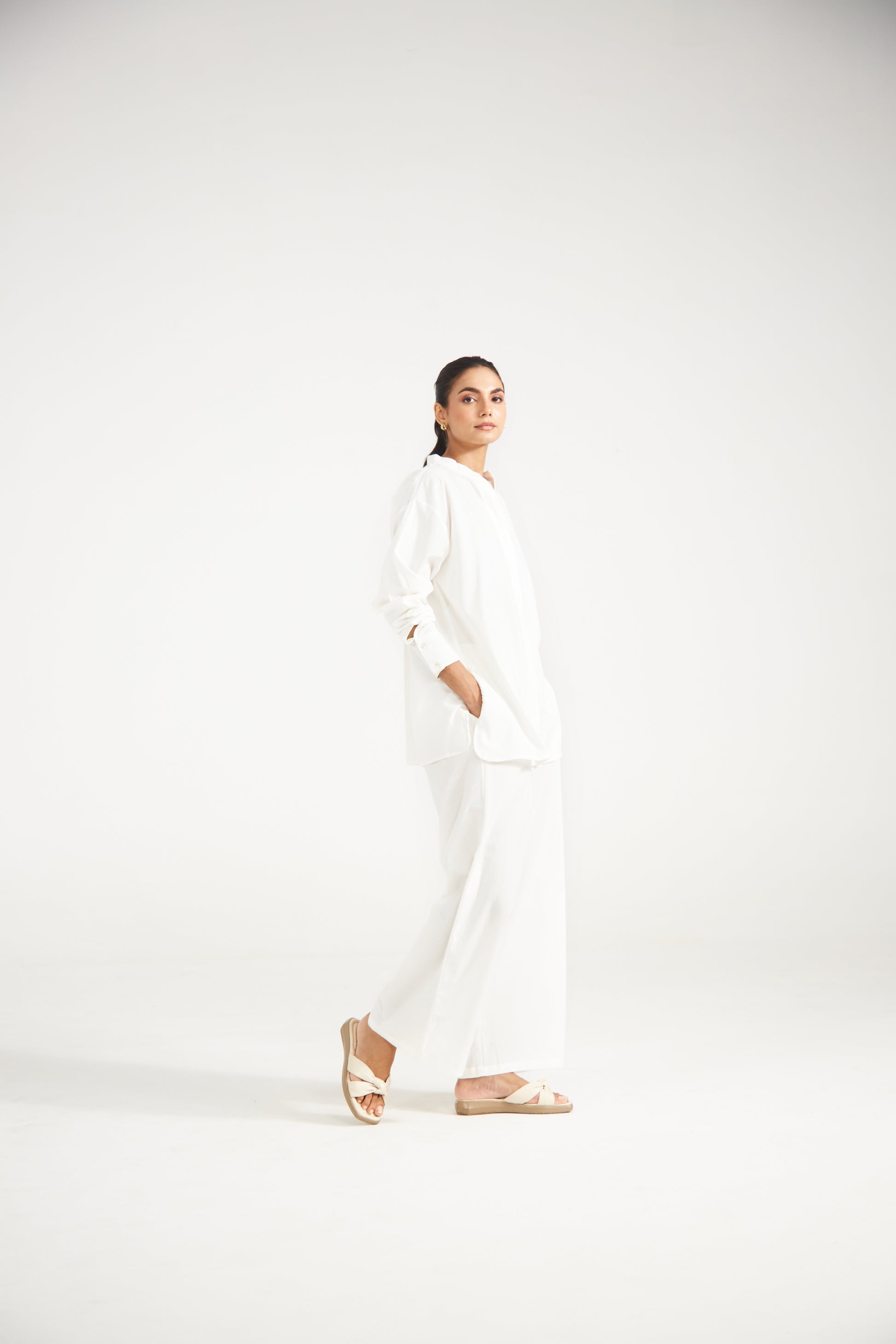 "White co-ord set features a straight-cut front open shirt with side slits. Paired with easy straight-fit trousers, it’s a versatile ensemble that moves seamlessly from casual days to understated gatherings.